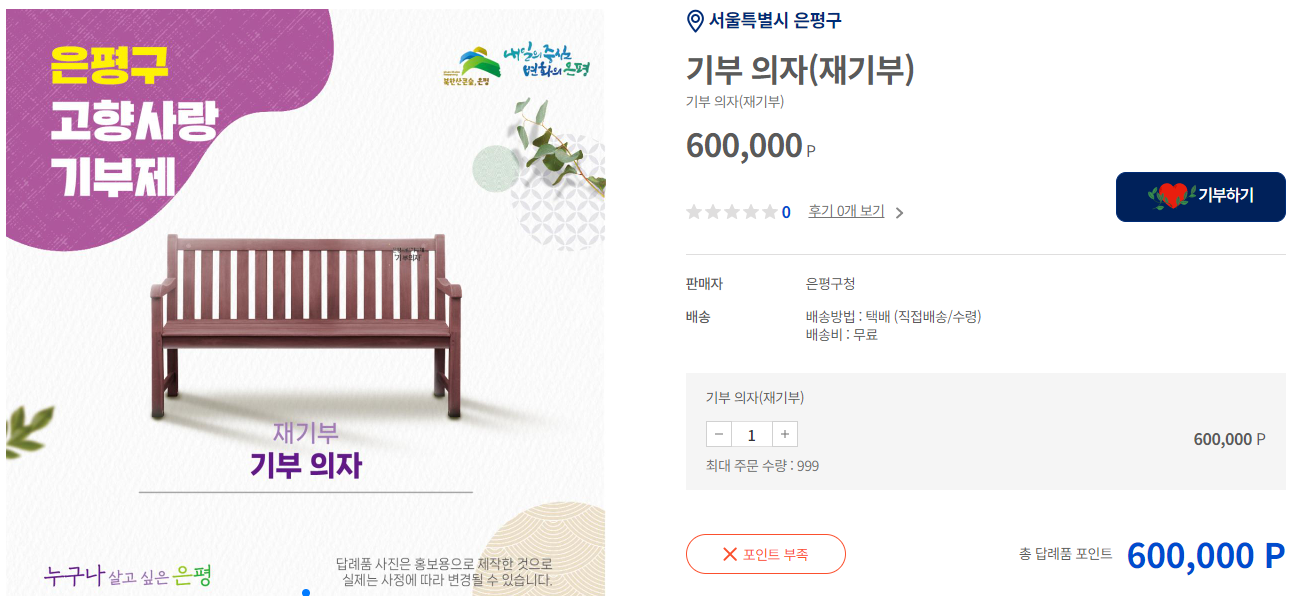 고액기부자를 위한 답례품인 듯 합니다. 은평구의 공원 등에 벤치를 설치하고 기부자의 사연과 이름이 담긴 기부명판을 부착한다고 합니다. 제가 고액기부가 가능하다면 이런 답례품 탐날 것 같습니다.