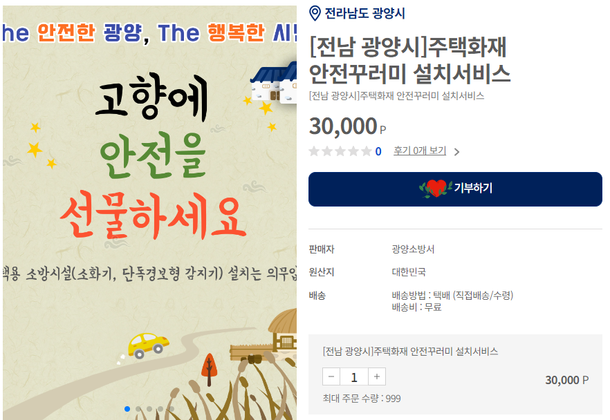 기부를 원하는 광양시의 어느 주소를 지정하면 해당 위치에 소화기와 단독경보형 감지기를 설치해준다고 합니다. 기업이 아니라 소방서에서 하는 사업이라니, 여기 소방서 칭찬 받아야 되요.