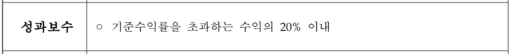 예시) 100억 총 투자(출자), 기준수익률 4%, 성과보수 지급 기준 비율 20%인 펀드가 회수 시 20억 수익(20% 수익)을 얻은 경우, 운용사에 지급할 성과보수