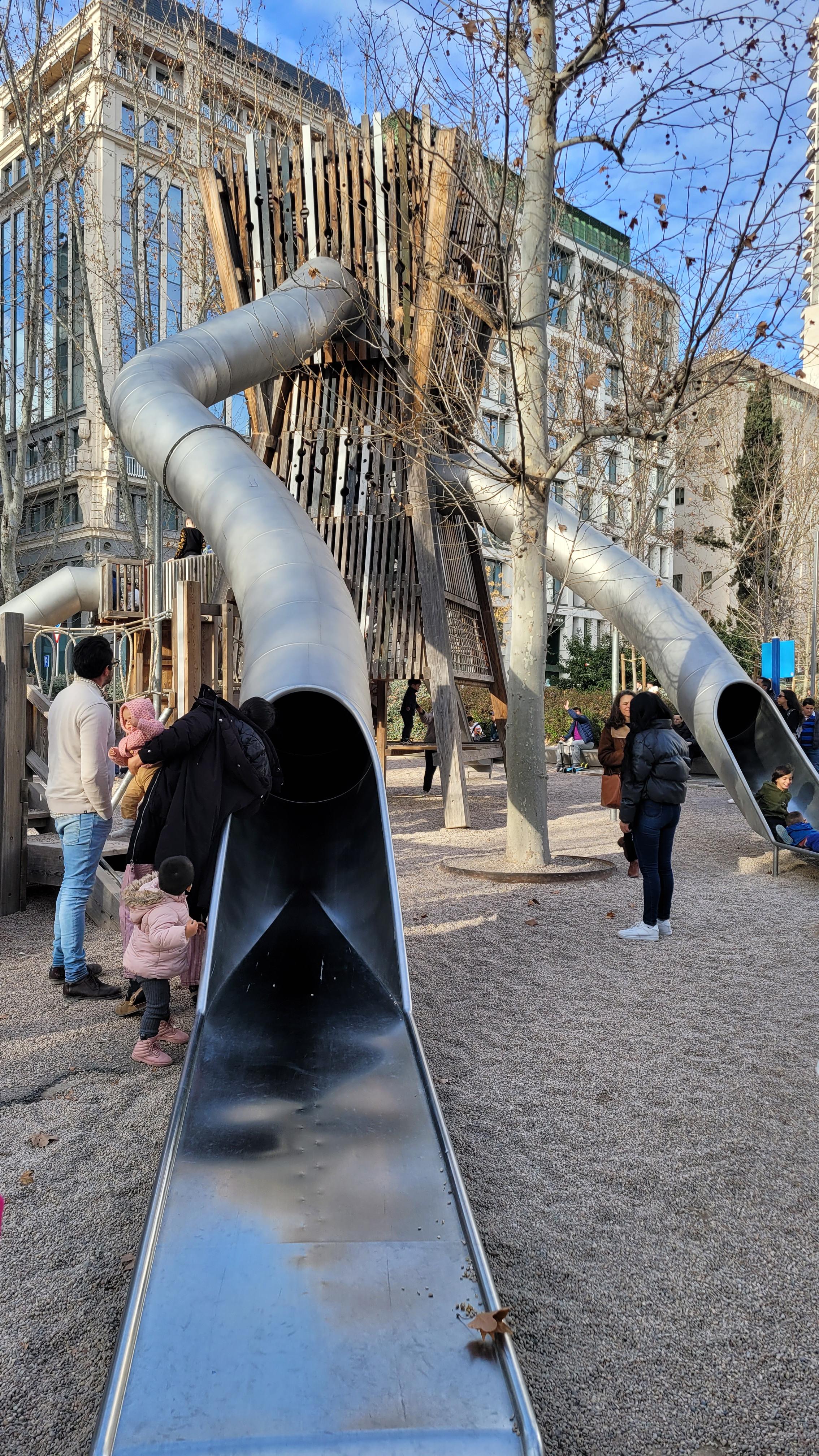 세르반테스 동상 앞 놀이터에 아이들이 많이 있었다. 4~5살 된 애들이 위험해 보이는 기구에 오르락 내리락하는 게 자연스럽다. 미끄럼틀이 3단계의 높이로 되어 있는데 첫째 아이는 제일 높은 데 올라가서 타고 내려왔다. 둘째는 올라갔다가 넘 높아서 무섭다며 다시 사다리 타고 내려옴. 미끄럼틀에서 먼저 내려온 아이가 아직 비키지 않았는데 뒤 순서 아이가 내려와서 부딪힌다. 우리 나라같으면 난리날 거 같은데 부모들도 아이들도 아무렇지 않게 일어나서 다시 놀러 간다.