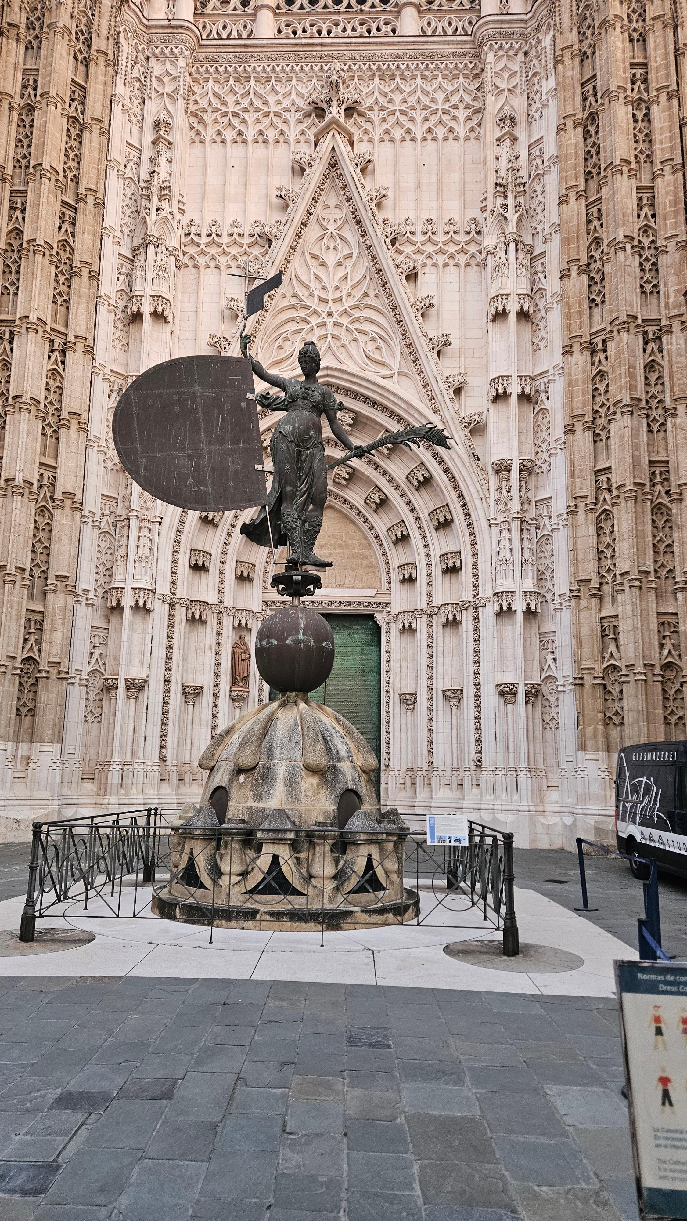 히랄다 탑 꼭대기에는 여성상 모양의 풍향계가 있는데 청소하고 복원하기 위해 원래 있던 걸 내리고 임시로 모조품을 잠시 달아두었었다고 한다. 복원이 다 끝나고 원래 있던 곳에 복귀시키고 임시로 달아두었던 모조품을 세비야 대성당 앞에 전시해두고 있다. 밑에서 아무리 봐야 안보이는 걸 이렇게 자세히 볼 수 있다.
