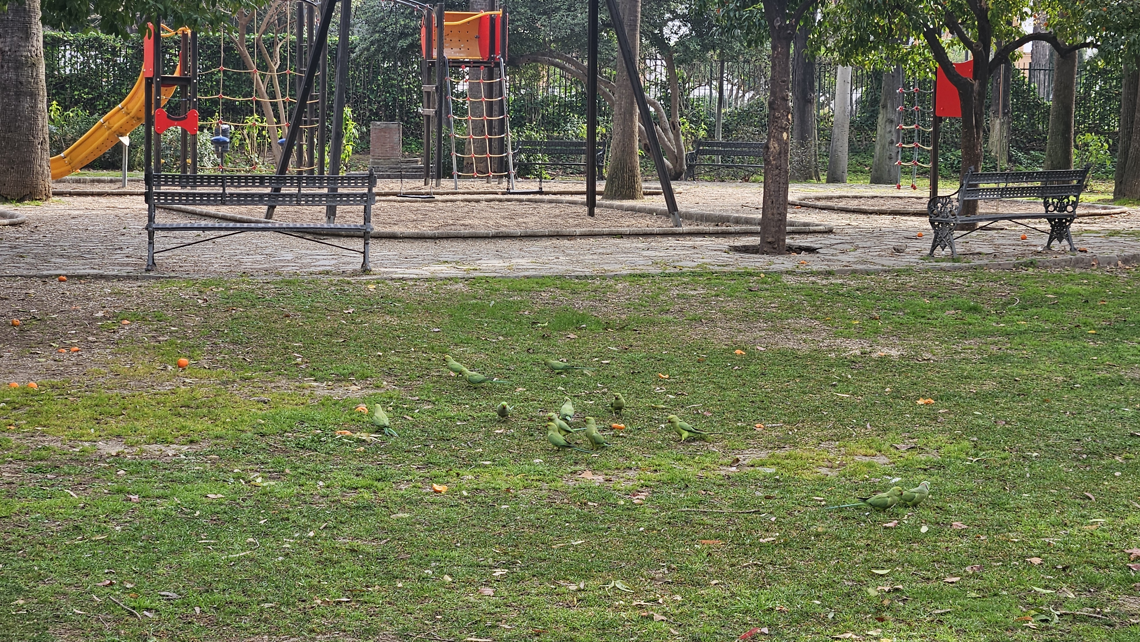 공원에 앵무새가 우리나라 참새마냥 앉아 있음.
